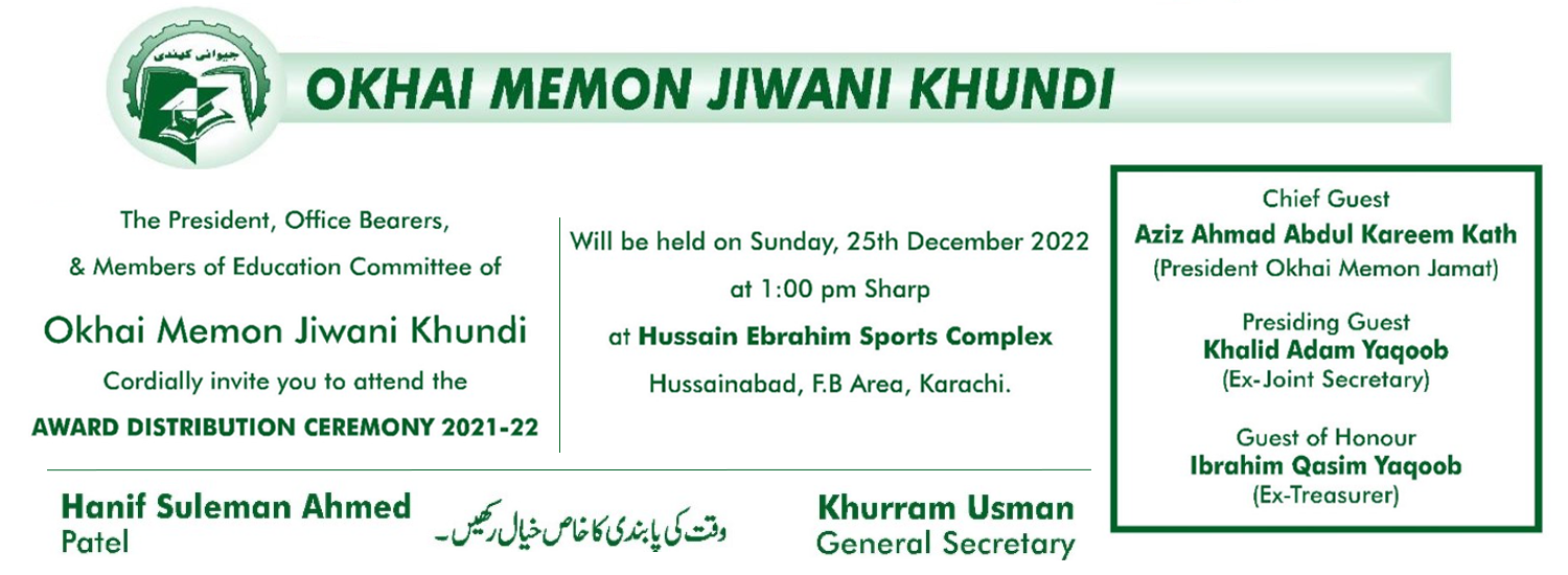The President, Office Bearers, & Members of the Education Committee of Okhai Memon Jiwani Khundi Cordially invite you to attend the AWARD DISTRIBUTION CEREMONY 2021-22 Will be held on Sunday, 25th December 2022 at 1:00 pm Sharp at Hussain Ebrahim Sports Complex Hussainabad, F.B Area, Karachi.