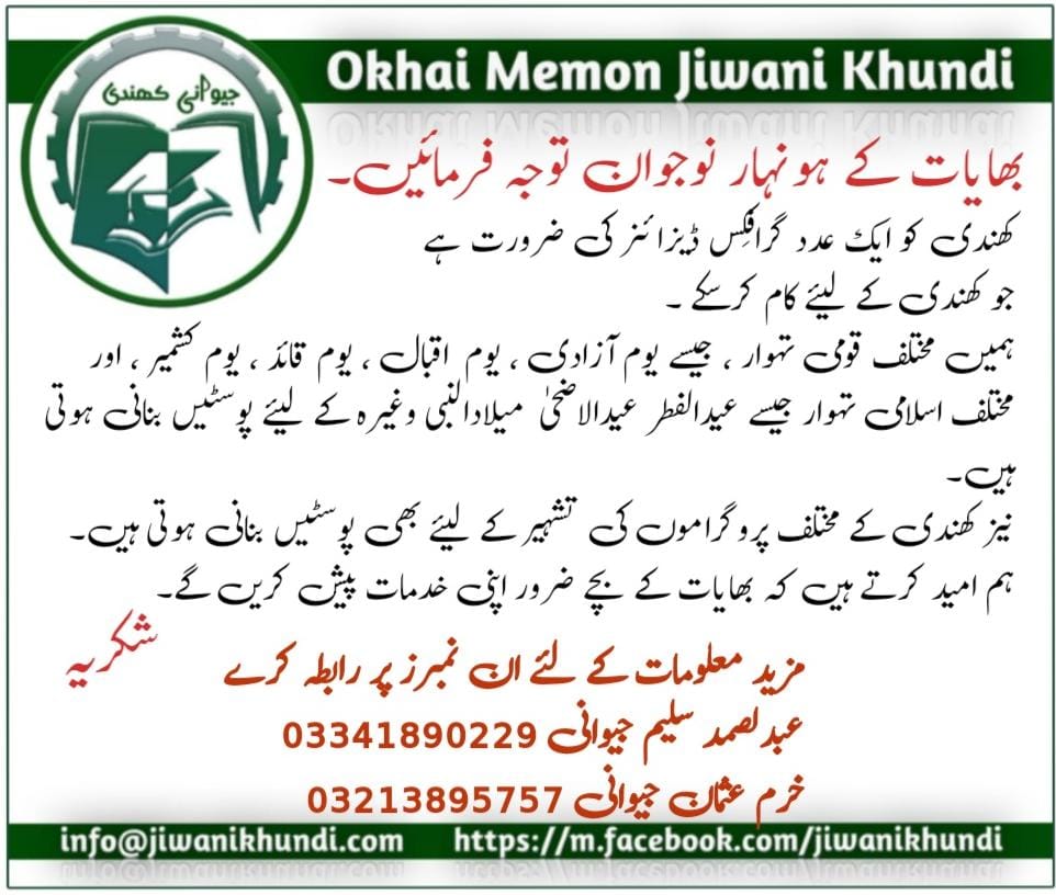 کھندی بھایات توجہ فرمائیں جیوانی کھندی کے وہ ہونہار بچّے یا بچّیاں جو کھندی کے لیے اپنی خدمات پیش کرنا چاہتے ہیں گرافکس ڈیزائنر کی حیثیت سے وہ اس پوسٹ میں دیے گئے نمبروں پہ رابطہ کریں