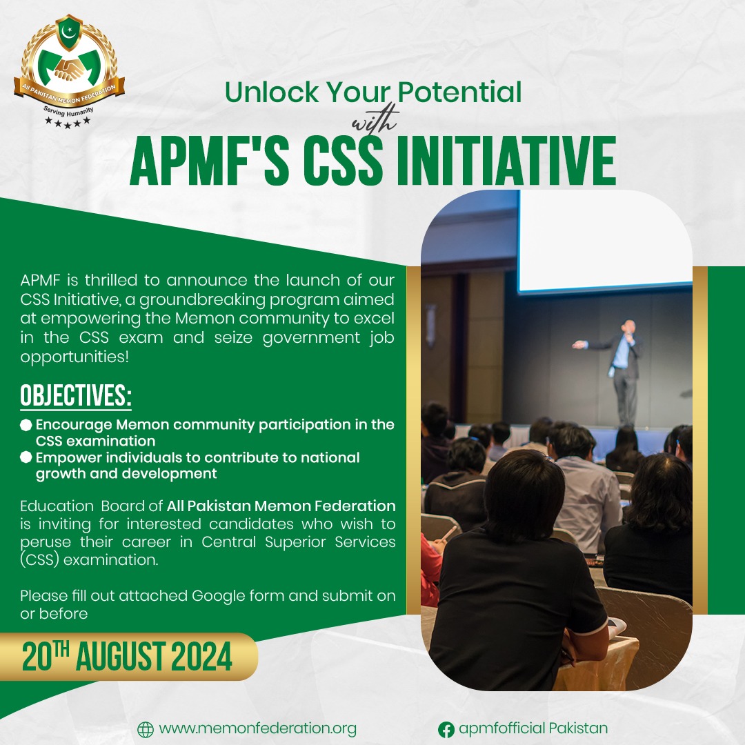 🚨 Attention Khundi Bhayat! 🚨 🌟 Unlock Your Potential with APMF's CSS Initiative! 🌟 🎓 Don't miss this golden opportunity to excel in the CSS exam and seize government job opportunities. Join the All Pakistan Memon Federation's groundbreaking program aimed at empowering the Memon community for a brighter future. 🌟 📌 Objectives: ✅ Encourage Memon community participation in the CSS examination. ✅ Empower individuals to contribute to national growth and development. 📝 How to Apply: Please fill out the attached Google form and submit it by 20th August 2024. Don’t wait—your future starts now! ⏳ Register yourself using the Google form link below on or before 20 August 2024. https://forms.gle/8DqfQwLot61uKzgL6