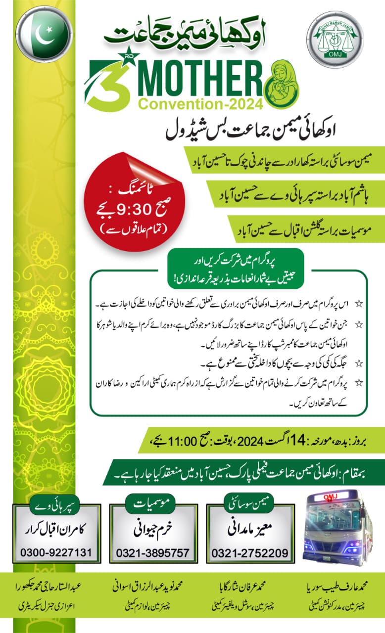 کھندی بھایات توجہ فرمائیں! 📢🔊 اوکھائی میمن جماعت 🌸 🎉 3RD MOTHER'S CONVENTION-2024 🎉 اوکھائی میمن جماعت بس شیڈول: 🚍 میمن سوسائٹی براستہ کھارادر سے چاندنی چوک تا حسین آباد ہاشم آباد براستہ سپرہائی وے تا حسین آباد موسمیات براستہ گلشن اقبال تا حسین آباد نوٹ!🕘 ٹائمنگ: صبح 9:30 بجے (تمام علاقوں سے) ⏰ 📌 علاقائی کوراڈینیٹر: میمن سوسائٹی: معیز مامدانی - 03212752209 📞 موسمیات: خرم جیوانی - 03213895757 📞 سپرہائی وے: کامران اقبال کرار - 03009227131 📞