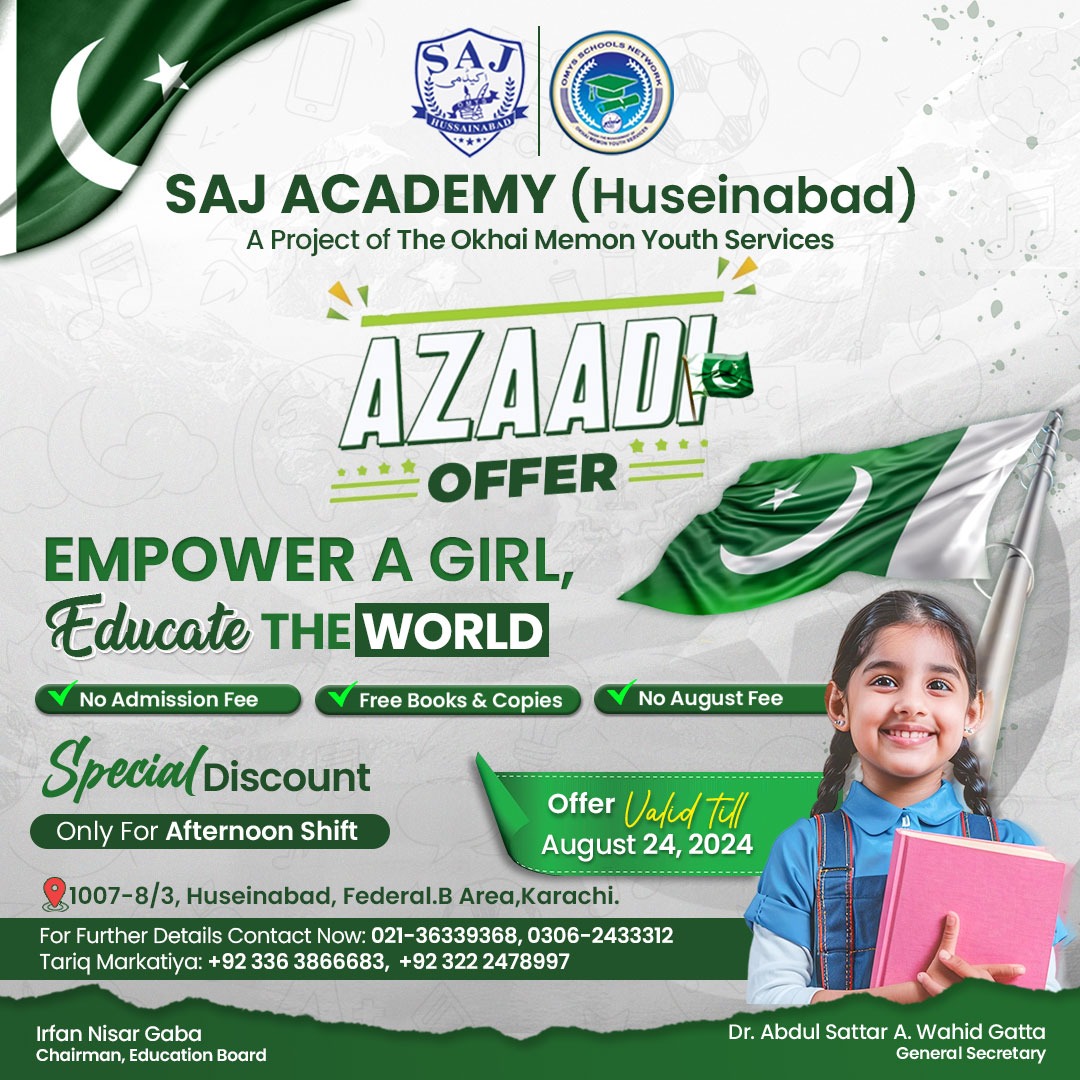 🎉 S.A.J Academy - A Project of Okhai Memon Youth Services 🎉 🌟 Azadi Offer 2024! 🇵🇰 Empower a Girl, Educate the World! 🌍✨ We believe in the power of education! This Independence Day, give your daughters the gift of knowledge with our special discounts for the Afternoon Shift (Girls Only) at SAJ Academy: ✅ No Admission Fee ✅ Free Books & Copies ✅ No August 2024 Fee ⏳ Offer Valid Till 24th August 2024 🚨 Limited Seats Available! Don't miss this golden opportunity—secure your spot today! 🎓 📍 Location: 1007-8/3, Hussainabad, Federal B Area, Karachi 📞 Contact Us: 021-36339368 | 0306-2433312 | +92 336 3866683 | +92 322 2478997