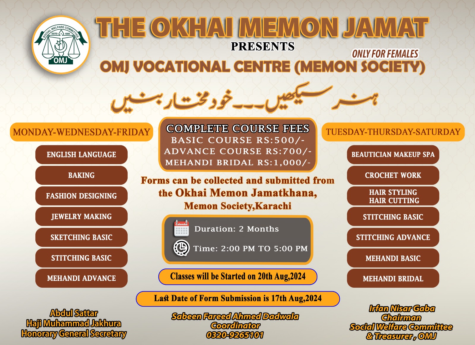 کھندی برادری توجہ فرمائیں! 📢🔊 اوکھائی میمن جماعت کے زیر اہتمام خواتین کے لیے خصوصی ووکیشنل کلاسز کا انعقاد! 🎉 اس اگست اور ستمبر میمن سوسائٹی میں بہترین کورسز کا آغاز کیا جارہا ہے! 🚀💪🏻 📚 دستیاب کورسز: ✨ مہندی (بیسک، ایڈوانس، برائڈل) 🎨 ✨ سلائی (بیسک، ایڈوانس) ✂️ ✨ انگلش لینگویج 🗣️ ✨ فیشن ڈیزائن 👗 ✨ فن خطاطی 🖋️ ✨ بیوٹیشن (میک اپ، ہئیر اسٹائل) 💄 ✨ بیکنگ 🍰 ✨ جیولری میکنگ 💍 ✨ کوریشہ ورک 🧵 📌 عمر کی کم از کم حد: 12 سال 🗓️ رجسٹریشن کی آخری تاریخ: 17 اگست 2024 🗓️ کلاسز کا آغاز: 20 اگست 2024 ⏰ وقت: دوپہر 2 بجے سے شام 5 بجے تک 🚨 جلدی کریں! محدود نشستیں دستیاب ہیں! 🚨 📞 مزید معلومات کے لیے رابطہ کریں: 03209265101 👩🏻🏫 سبین فرید دادوالا - کوآرڈینیٹر 👨🏻💼 عرفان نثار گابا - چیئرمین سوشل ویلفیئر کمیٹی