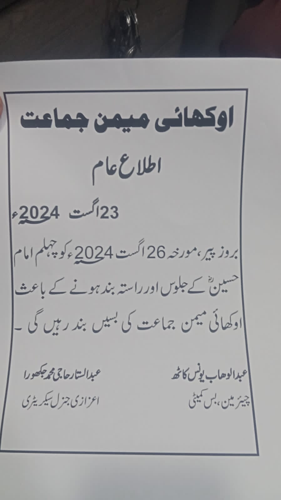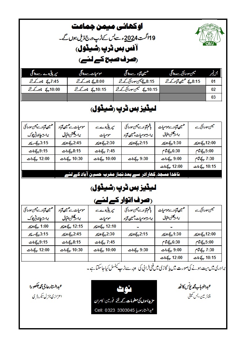 اہم اعلان برائے اراکین اوکھائی میمن جماعت 📢 براہ کرم نوٹ کریں کہ پیر، مورخہ 26 اگست 2024 کو جلوسِ امام حسینؓ کے باعث اوکھائی میمن جماعت کی بسیں بند رہیں گی۔ 🚍❌ اپنی منصوبہ بندی کریں اور کسی بھی قسم کی تکلیف سے بچنے کے لیے متبادل انتظامات کریں۔ براہ کرم اس پیغام کو زیادہ سے زیادہ پھیلائیں تاکہ تمام اراکین تک اطلاع پہنچ سکے۔ مزید معلومات کے لیے کمیٹی کے نمائندگان سے رابطہ کریں۔ جزاکم اللہ خیر 🌸