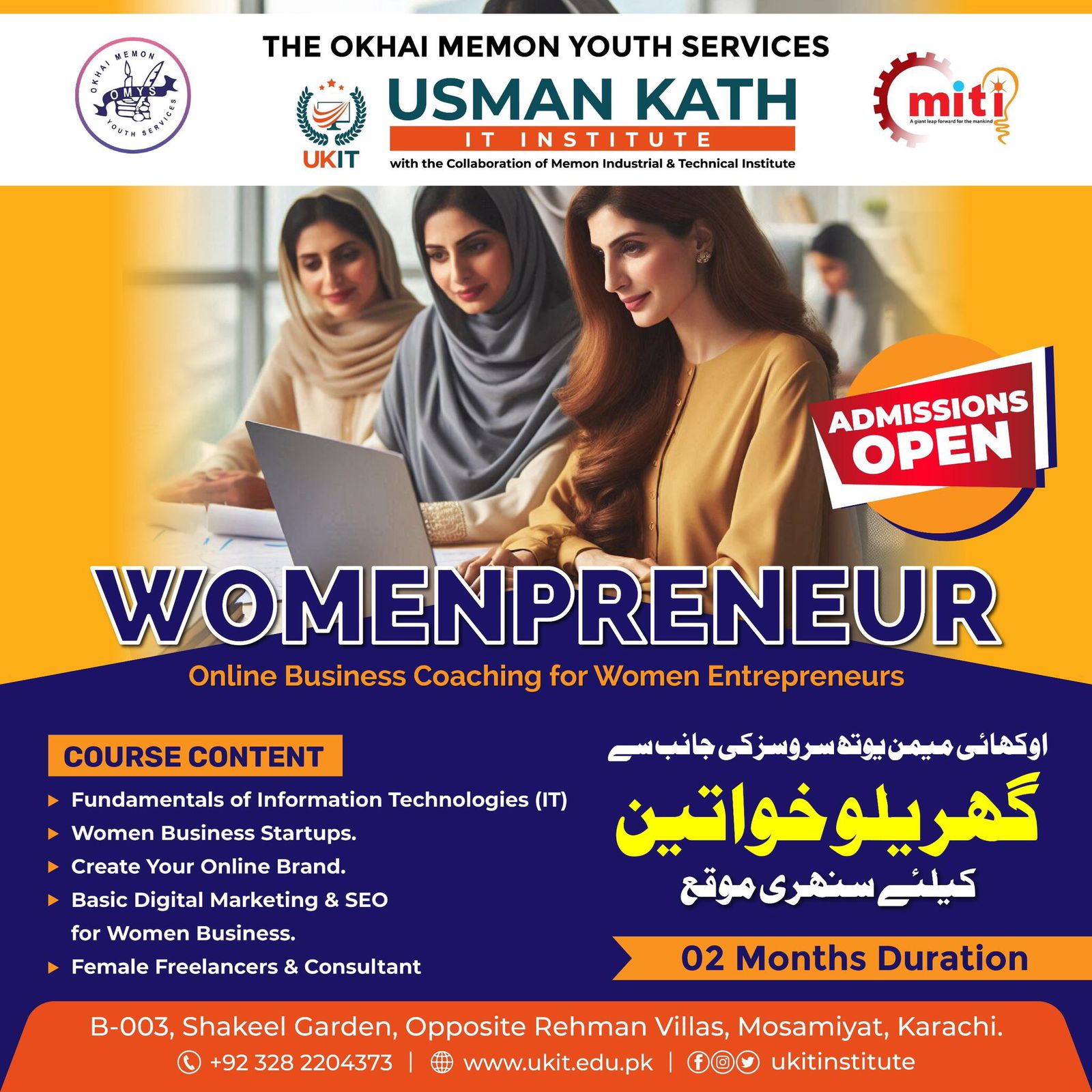 🌟 Calling All Ambitious Housewives! 🌟 Are you ready to LEVEL UP your skills and thrive in today’s fast-paced world? 🌍 Here’s your GOLDEN OPPORTUNITY to ENHANCE your talents with our Womenpreneur program, tailored specifically for Housewives looking to make a mark in the business world! 🚀 Why Enroll? Acquire Essential IT Skills 💻 Learn How to Start Your Own Business 🚀 Create & Grow Your Online Brand 🌐 Master Digital Marketing & SEO 📈 Become a Successful Freelancer & Consultant 💼 Don’t wait! Empower yourself for a brighter future. Enroll NOW and take the first step towards SUCCESS! ✨ 📆 Duration: 2 Months 📍 Location: UKIT Institute, Shakeel Garden, Mosamiyat, Karachi 📞 Contact: +92 328 2204373