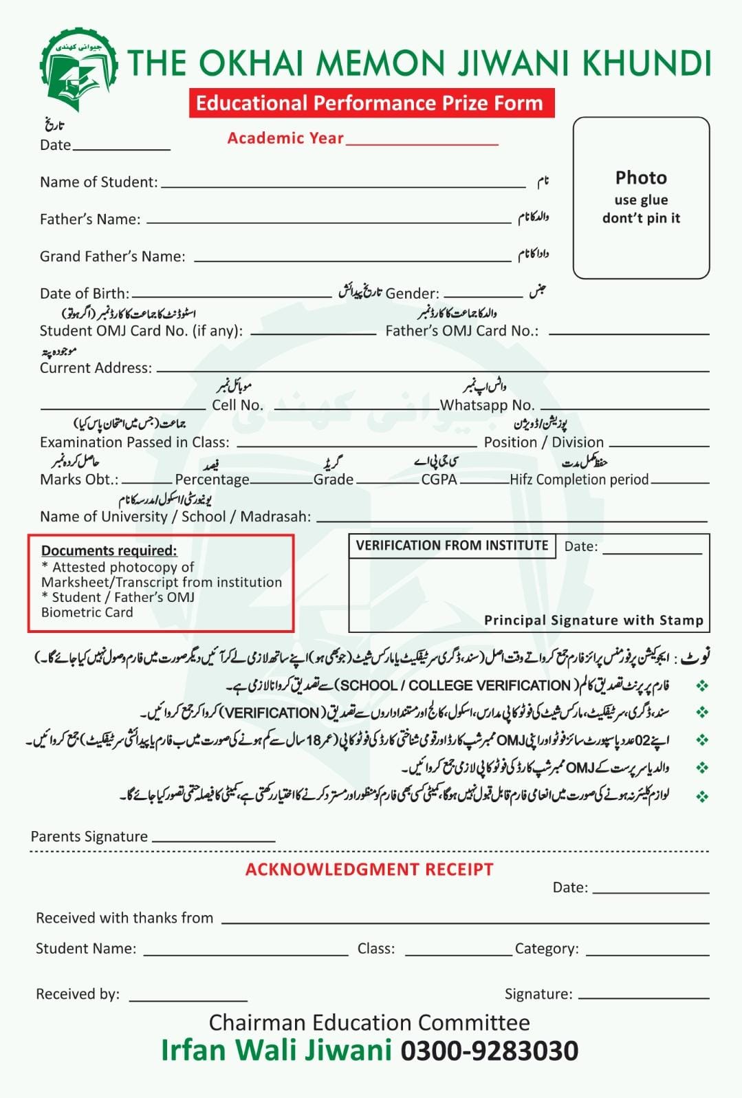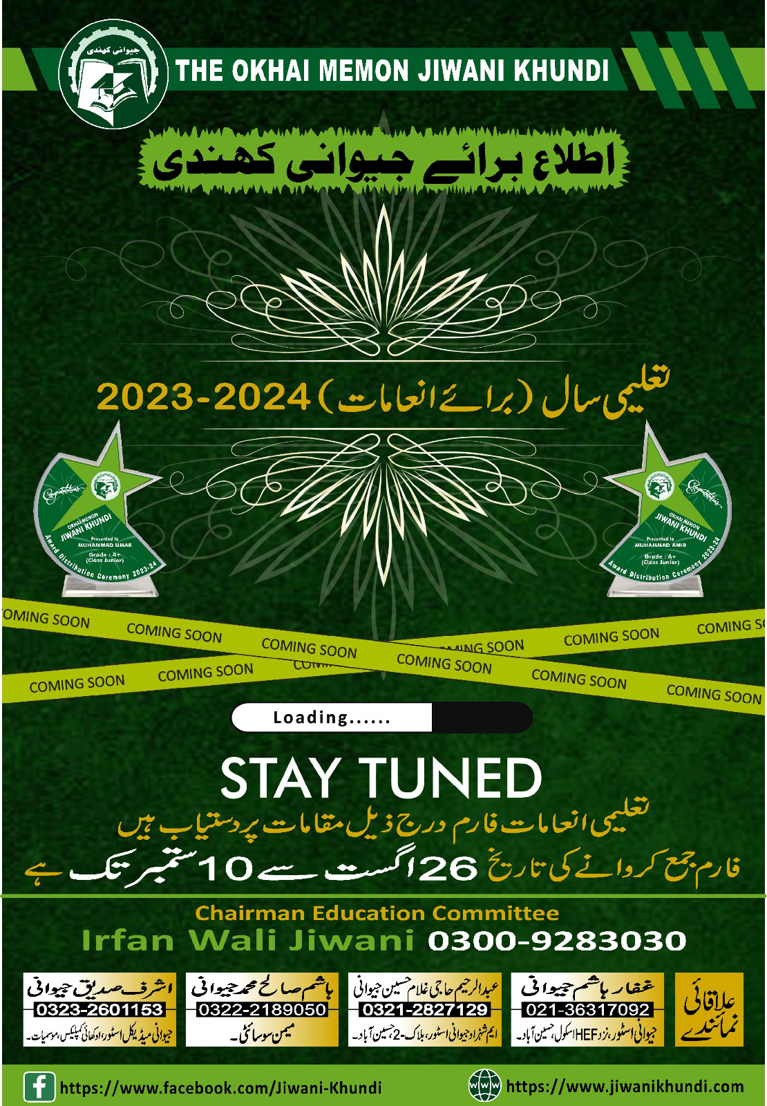 🎉 Jiwani Khundi Prize Distribution 2023-2024 is Here! 🎉 📢 Attention, Students! The time has come to reward your hard work and dedication! The Educational Performance Prize Forms for the academic year 2023-2024 are now available at all Points. Don't miss this golden opportunity to get recognized for your academic excellence! 🌟 📝 Form Submission Period: 🗓 26th August to 10th September 2024 📍 Available at the following locations: Point 1: Name: - Ghaffar Hashim Jiwani. Location: - Jiwani Store, Near H.E.F School, Hussainabad. Contact No: - 021-36317092. Point 2: Name: - Abdul Raheem Haji Ghulam Hussain Jiwani. Location: - M. Shahzad Jiwani Store, Block 2, Hussainabad. Contact No: - 0321-2827129. Point 3: Name: - Hashim Saleh Muhammad Jiwani. Location: - Memon Society. Contact No: - 0322-2189050. Point 4: Name: - Ashraf Siddiq Jiwani. Location: - Jiwani Medical Store, Okhai Complex, Mosmiyaat. Contact No: - 0323-2601153. 🏅 Who Can Apply? All those students who meet the criteria mentioned in the flyer can submit their forms for a chance to receive this prestigious prize. This is your moment to shine! 🌠 ✅ Required Documents: - Attested photocopy of your mark sheet or transcript - Student/Father's OMJ Biometric Card - Verification from your institution and other Required documents as mentioned in the Flyer ✨ Make sure to have everything ready and submit it before the deadline! 📞 For Queries, Contact: Chairman Education Committee: Irfan Wali Jiwani - 0300-9283030 Let’s make this year even more rewarding by acknowledging your brilliant academic journey! 🏆✨ 📢 Spread the Word! Tag your friends and let’s celebrate academic excellence together!