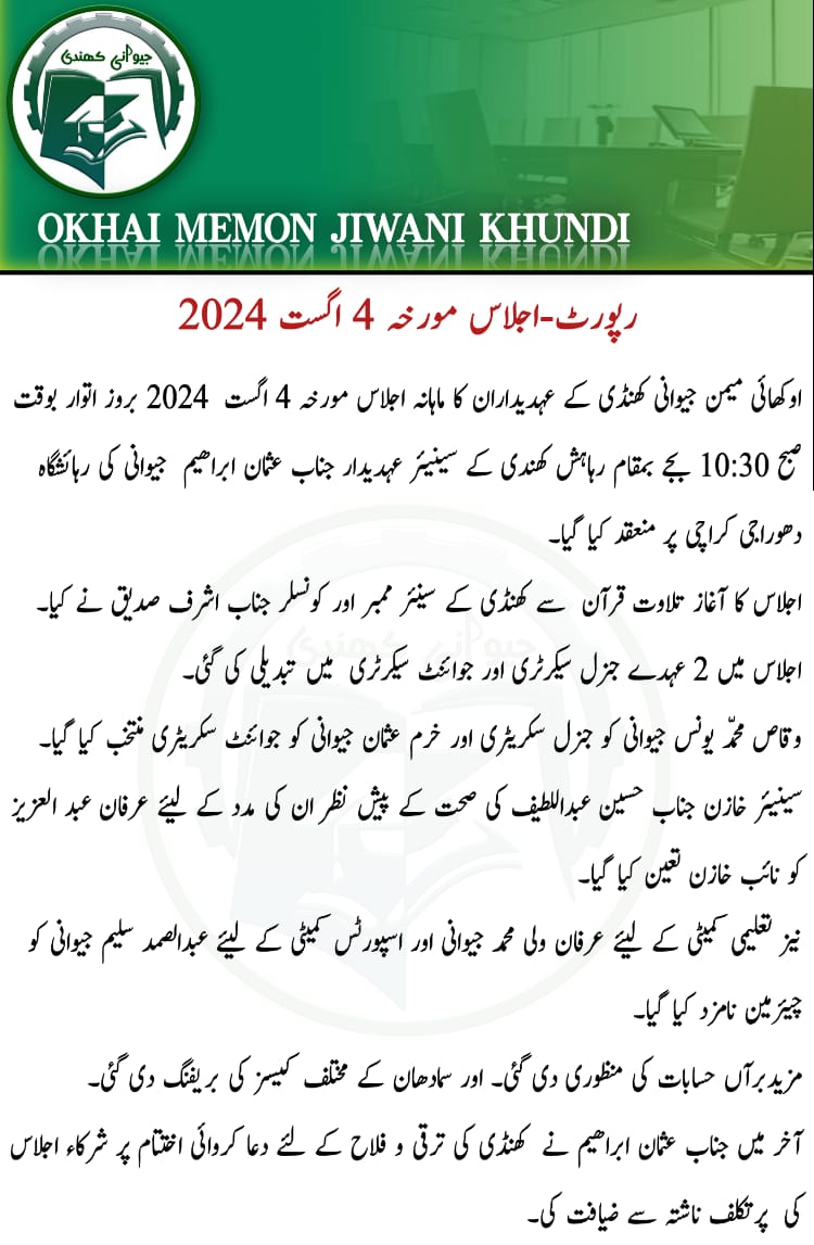 اوکھائی میمن جیوانی کھندی کی اہم اجلاس کی رپورٹ 🗓️ ✨ 4 اگست 2024 کو سینئر عہدیدار جناب عثمان ابراہیم جیوانی کی رہائشگاہ پر اوکھائی میمن جیوانی کھندی کے عہدیداران کا ماہانہ اجلاس منعقد ہوا۔ اجلاس میں اہم فیصلے کیے گئے جن میں نئے عہدیداران کی تقرری اور دیگر اہم امور شامل تھے۔ 💡 اجلاس کا آغاز تلاوتِ قرآن پاک سے ہوا اور مختلف موضوعات پر غور و خوض کیا گیا۔ نئے عہدیداران کی تقرری کے ساتھ ساتھ کمیٹی کی جانب سے متفرق کمٹیوں کی تشکیل پر بھی بات چیت کی گئی۔ 👥 اہم فیصلے: - وقاص محمد یونس جیوانی کو جنرل سیکرٹری اور خرم عثمان جیوانی کو جوائنٹ سیکرٹری منتخب کیا گیا۔ - سینئر خازن جناب حسین عبدالطیف کی صحت کے لیے دعائیں کی گئیں اور ان کی نگرانی کے لیے ٹیم نامزد کی گئی۔ - مزید مختلف سسٹمز کی بہتری کے لیے اقدامات پر بھی غور ہوا۔ 💬 آخر میں جناب عثمان ابراہیم نے کھندی کی ترقی اور فلاح کے لیے دعا کی اور اجلاس کا اختتام پر پرتکلف ناشتے کے ساتھ کیا گیا۔